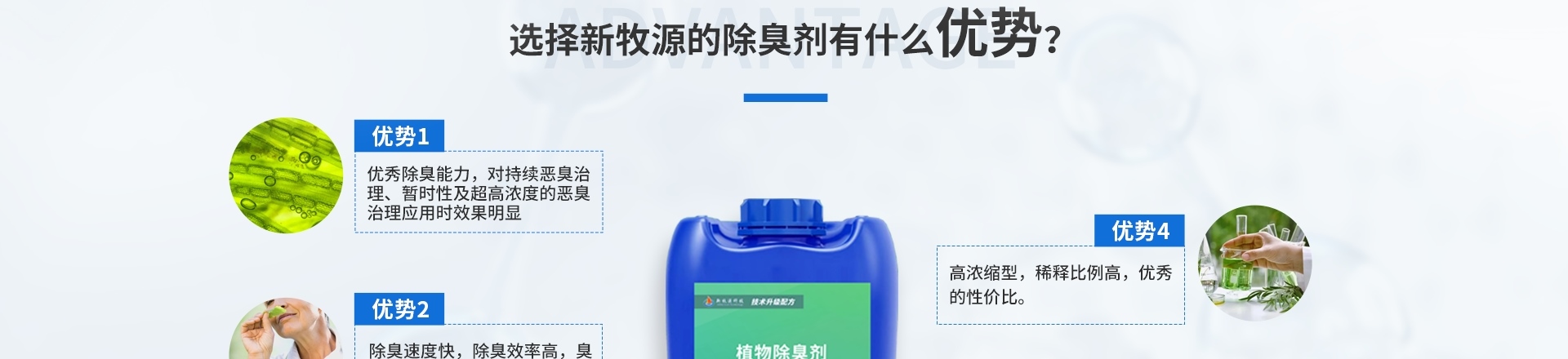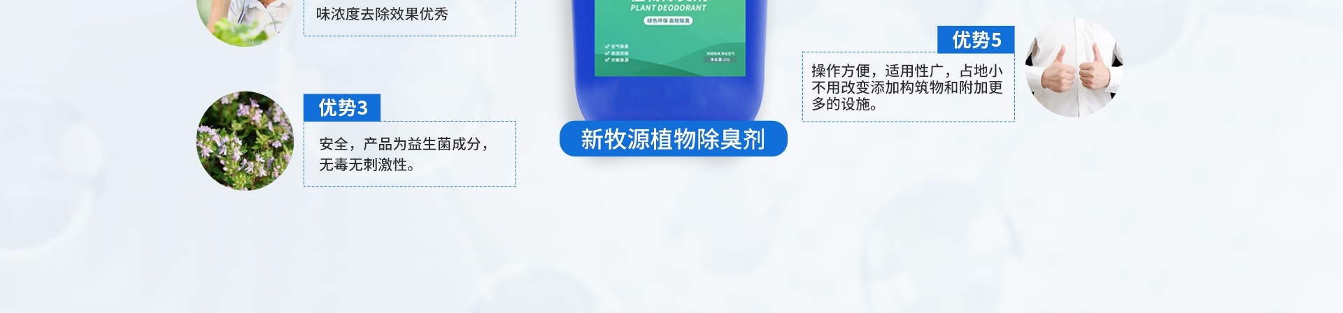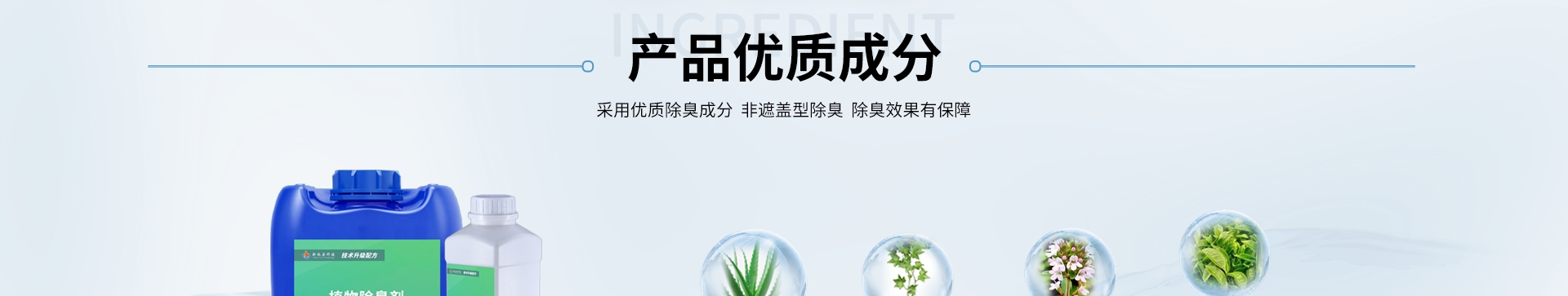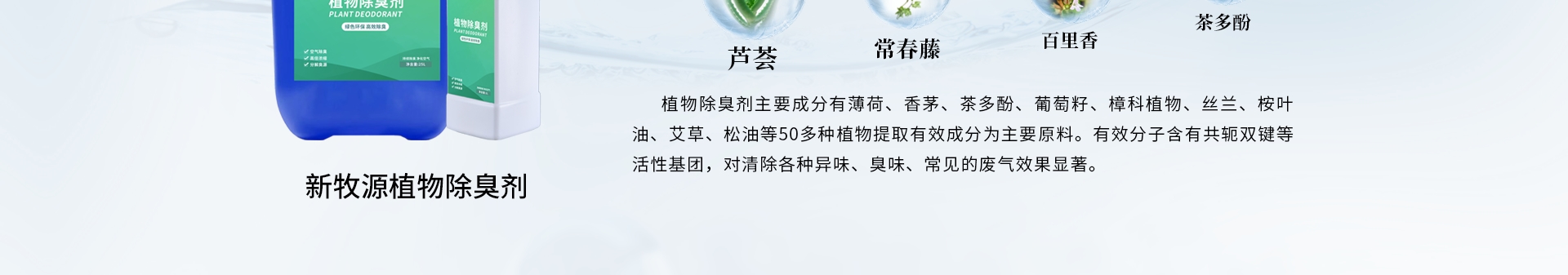 從天然植物中分離提取的天然成分,具有抑菌、殺菌和除臭功效,對氨、硫化氫等無機物和低分子脂肪酸、胺類、醛類、酮類、醚類、鹵代烴等有機物等惡臭有吸附、遮蓋、良好的分解,或者與異味分子發生碰撞, 進行反應,促使異味分子發生改變原有分子結構, 使之失去臭味,達到去除臭味的效果。